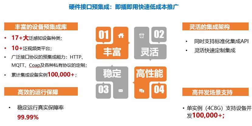 迄今開云電競公司已經(jīng)預(yù)集成17+大泛感知設(shè)備種類,10+泛視頻類平臺,廣泛接口協(xié)議的預(yù)集成能力涵蓋了HTTP、MQTT、Coap及各種私有協(xié)議的定制,累計集成設(shè)備實例達100,000+。它還支持標準化集成API,可靈活快速地定制集成,通過構(gòu)建規(guī)則引擎,實現(xiàn)了各設(shè)備間的聯(lián)動應(yīng)用,比如檢測到違規(guī)停車,聯(lián)動廣播就會自動播報提醒,為社區(qū)管理服務(wù)賦能。