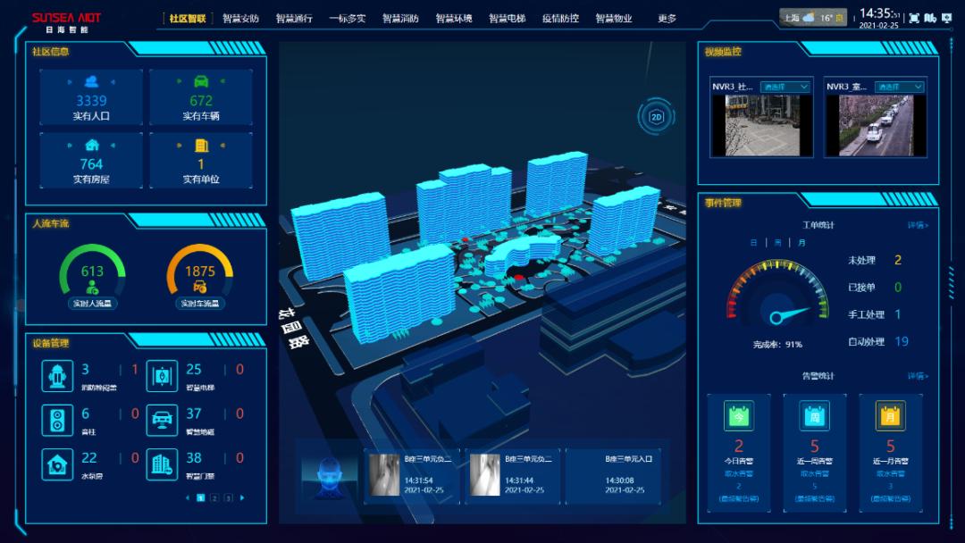 社區(qū)應(yīng)用平臺結(jié)合底層AIOT的物聯(lián)能力,將人、車、物的數(shù)據(jù)進行融合分析應(yīng)用,實現(xiàn)了人-設(shè)備-事件實時感知,動態(tài)聯(lián)動,在該平臺上可以全面直觀地展示小區(qū)人、車、物、房的運行狀態(tài),為小區(qū)閉環(huán)管理、社區(qū)綜合治理和公安執(zhí)法監(jiān)督提供高效、準確、及時的有力支持。比如通過二維/三維地圖,可以展示小區(qū)樓棟和智能設(shè)施的整體分布,以及小區(qū)房間和人員構(gòu)成,方便管理者掌握小區(qū)進出人員和車輛,加強社區(qū)安全防控。再如打通了門禁、可視對講、停車、視頻監(jiān)控、電梯、物業(yè)管理等多個終端系統(tǒng),有助管理人員便捷操作,大大節(jié)約管理成本。